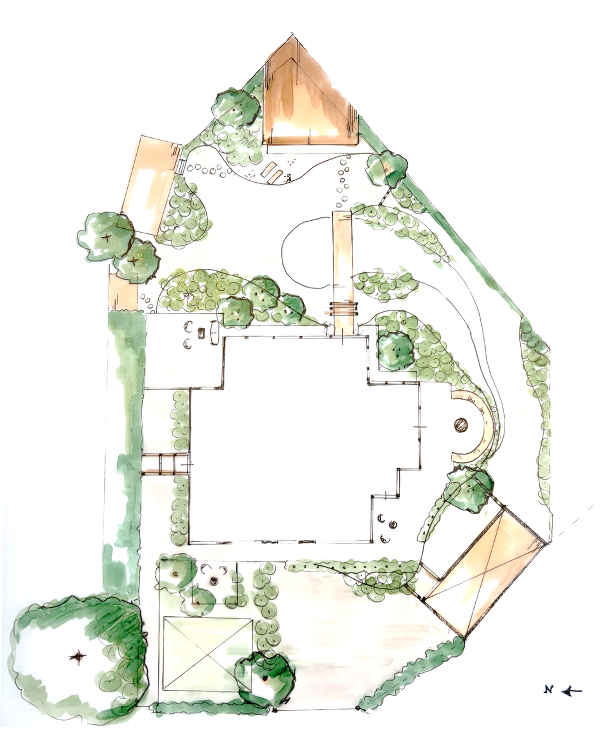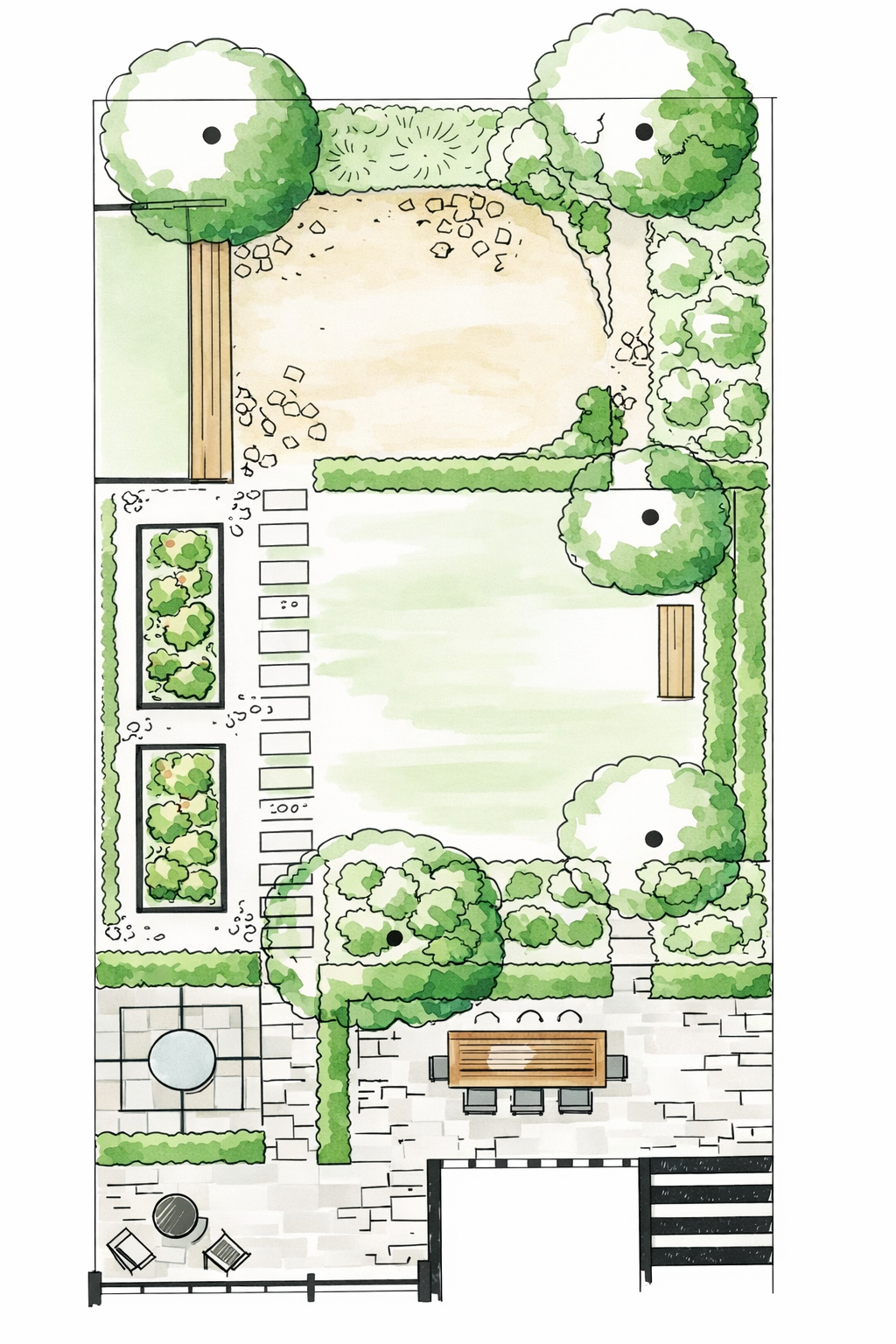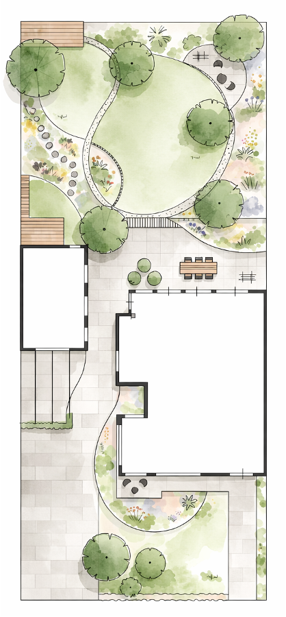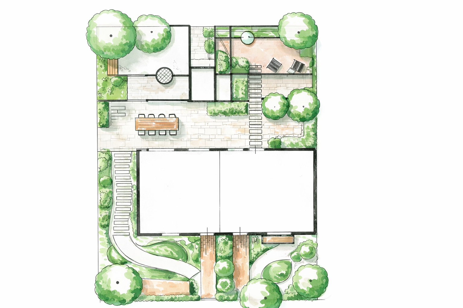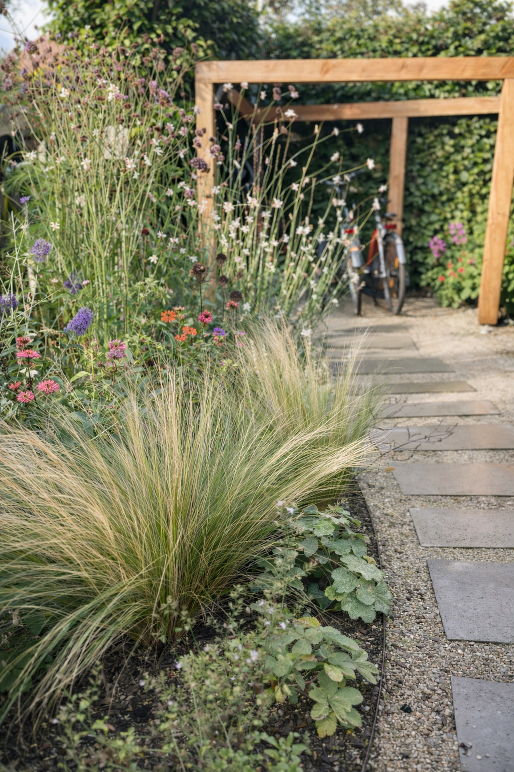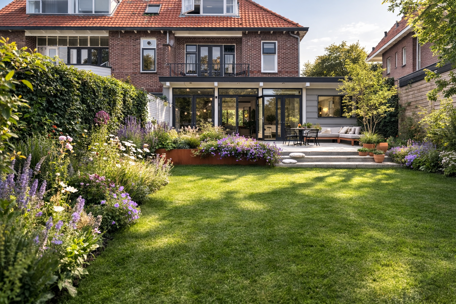 Een volledig tuinontwerp voor een jaren ’20 woning in Heemstede. Heldere lijnen en een weelderige, naturalistische beplanting.